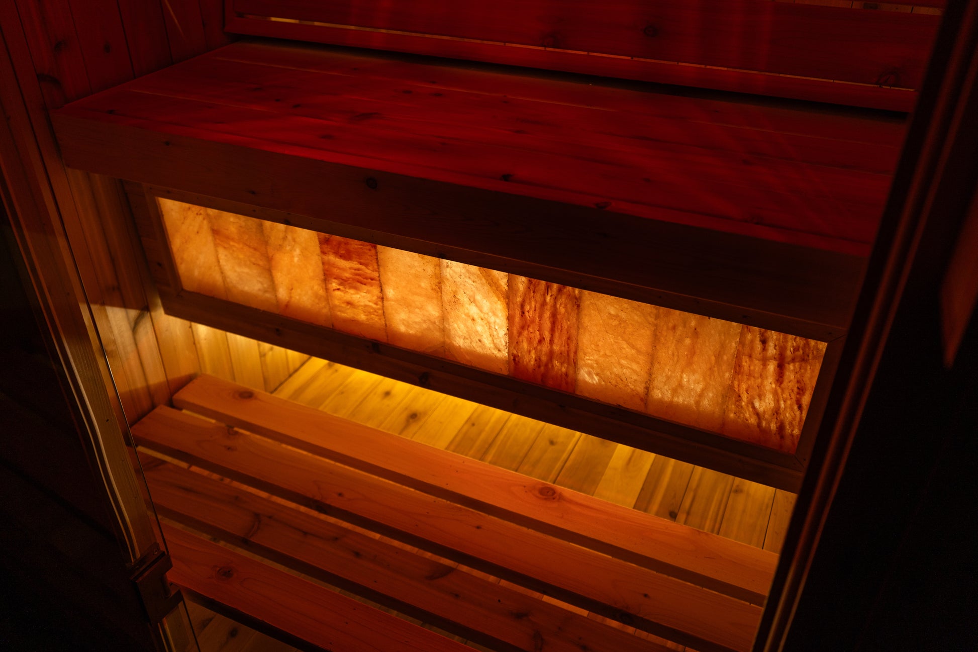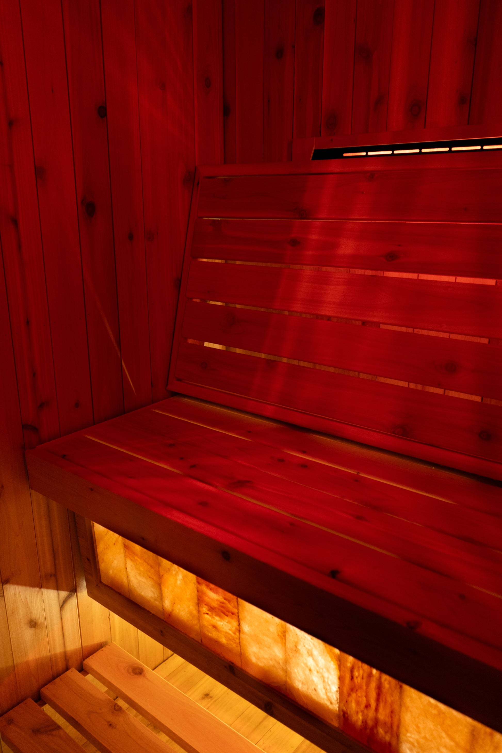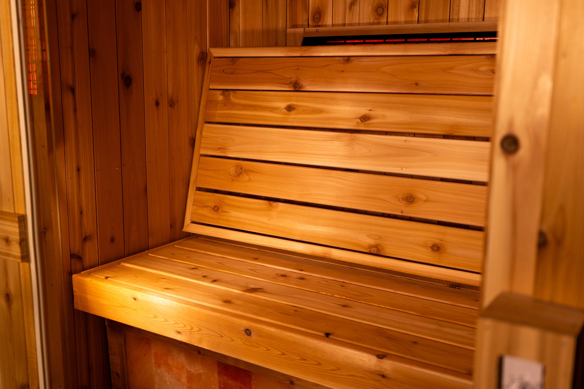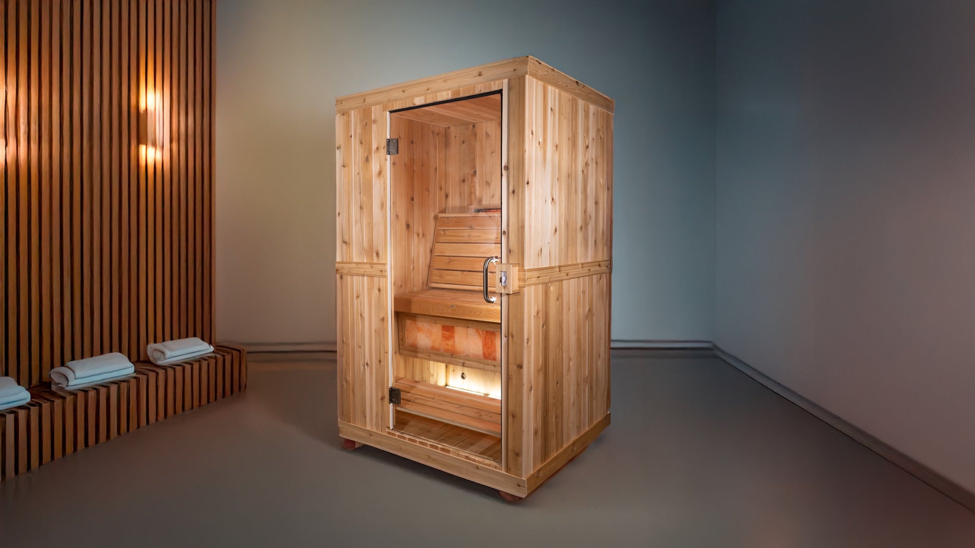 The Himalayan salt brick accent wall adds therapeutic benefits and looks gorgeous, so you can luxuriate in a tranquil sauna experience and elevate your wellness journey everyday.
